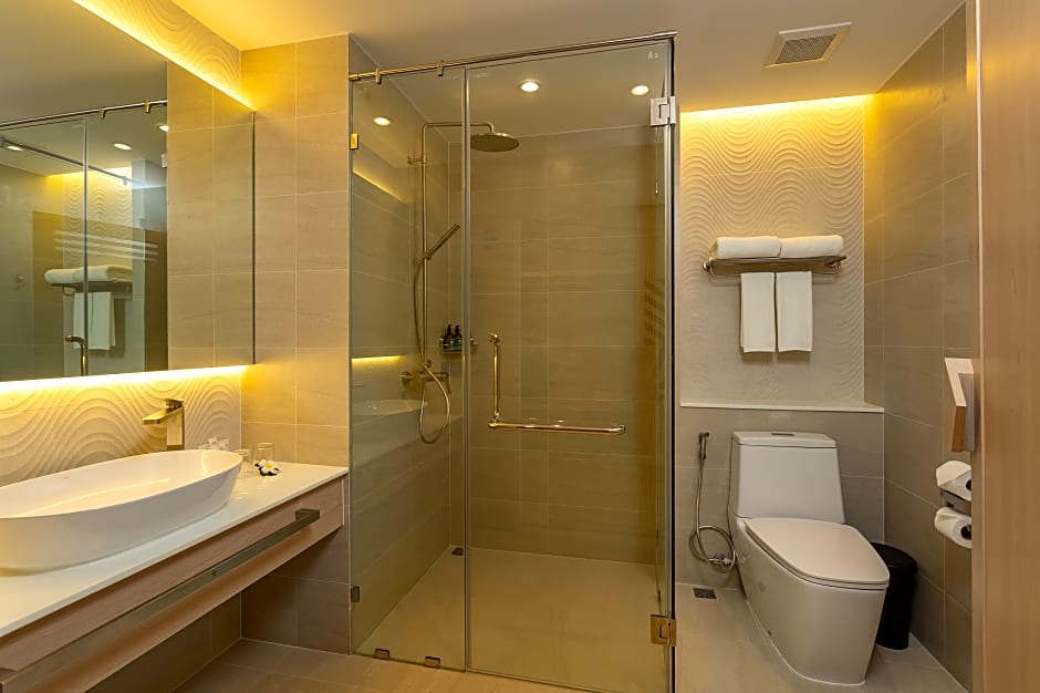 The spacious twin/double room features air conditioning, a seating area, a balcony with pool views as well as a private bathroom boasting a walk-in shower.