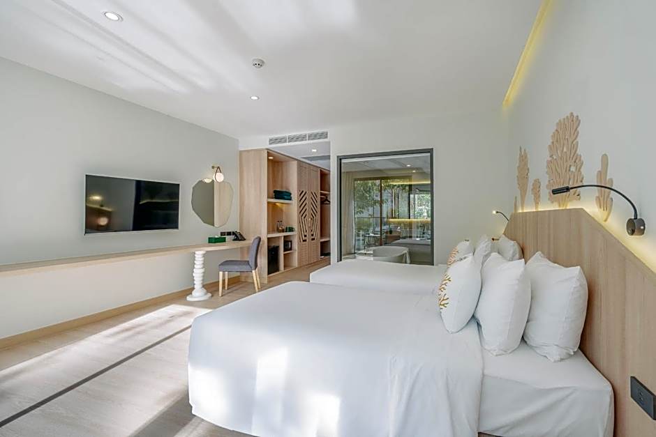 Deluxe Pool Access is 495 square feet and includes 2 single beds 80-130 width plus balcony, hairdryer, safe, bathrobes, and slippers.